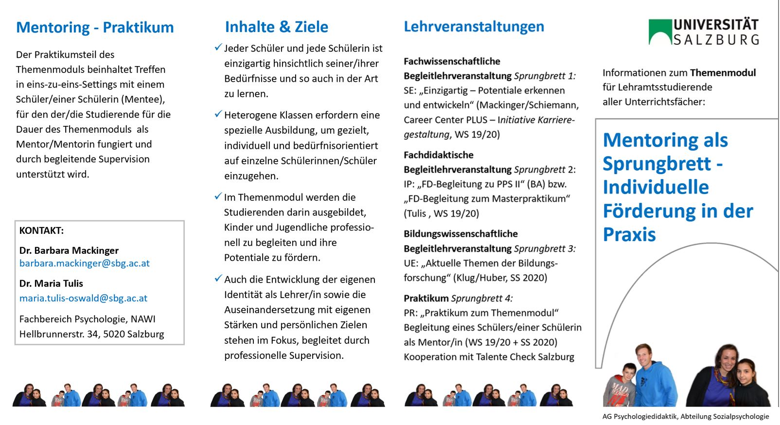 Seit dem WS 2019/20 wird das Projekt als Themenmodul „Mentoring als Sprungbrett – Individuelle Förderung in der Praxis“ im Rahmen der Lehrer/innenbildung fortgesetzt.