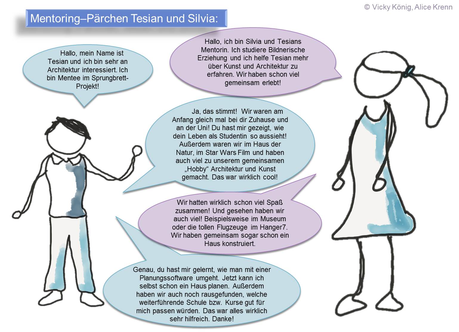 Der:die Mentee (Schüler:in) soll zum einen Begleitung und Unterstützung auf dem Bildungsweg erfahren (z.B. neue Lernstrategien erproben, bei Tiefschlägen motiviert werden, fachliche Förderung beim Lernen), und zum anderen seine:ihre Fähigkeiten und Interessen mit dem:der Mentor:in identifizieren und weiterentwickeln (z.B. Besuche von Bildungseinrichtungen, Interessensdiagnostik durch Psychologiestudierende). Weiters stellt der:die Mentor:in für den:die Mentee ein wichtiges zusätzliches Rollenmodell dar und ermöglicht den Kontakt zum akademischen Umfeld, um damit vertrauter zu werden z.B. durch Besuche an der Universität und Kennenlernen von Personen mit akademischen Berufen (z.B. Doktorand:innen, die eine Laborführung machen). Unten ist ein Beispiel von einem Mentoring-Pärchen (Mentee Tesian mit Mentorin Silvia), die das gemeinsame Hobby Architektur teilen und über ihre gemeinsamen Erlebnisse berichten: