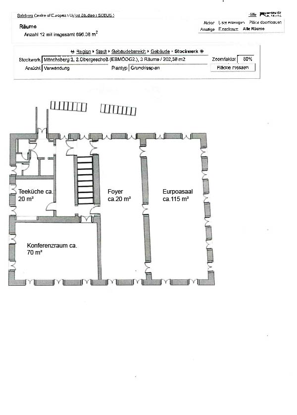 Das Ensemble der Beletage ist ca 300m² groß, veranstaltungsbehördlich genehmigt und in Summe für 150 Personen zugelassen; im Europasaal dürfen sich max. 121 und im Konferenzraum max. 48 Personen aufhalten.
