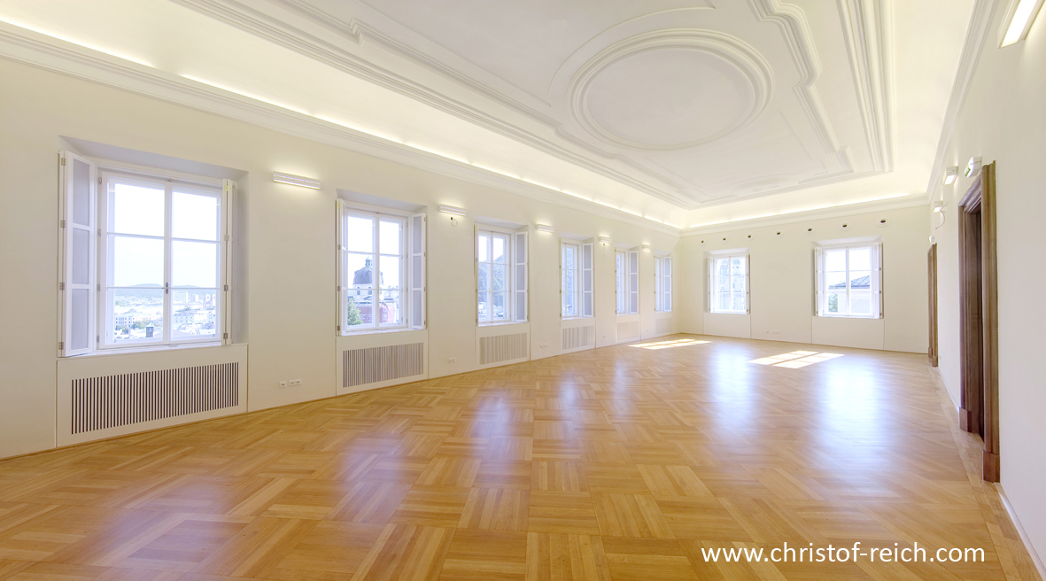Der Europasaal mit Blick auf Salzburgs Altstadt, eignet sich ausgezeichnet für Tagungen, Vorträge, Konzerte und Lesungen. Seine Bestuhlung lässt sich individuell gestalten; er ist mit moderner Präsentationstechnik ausgestattet.