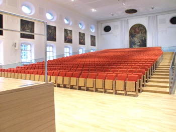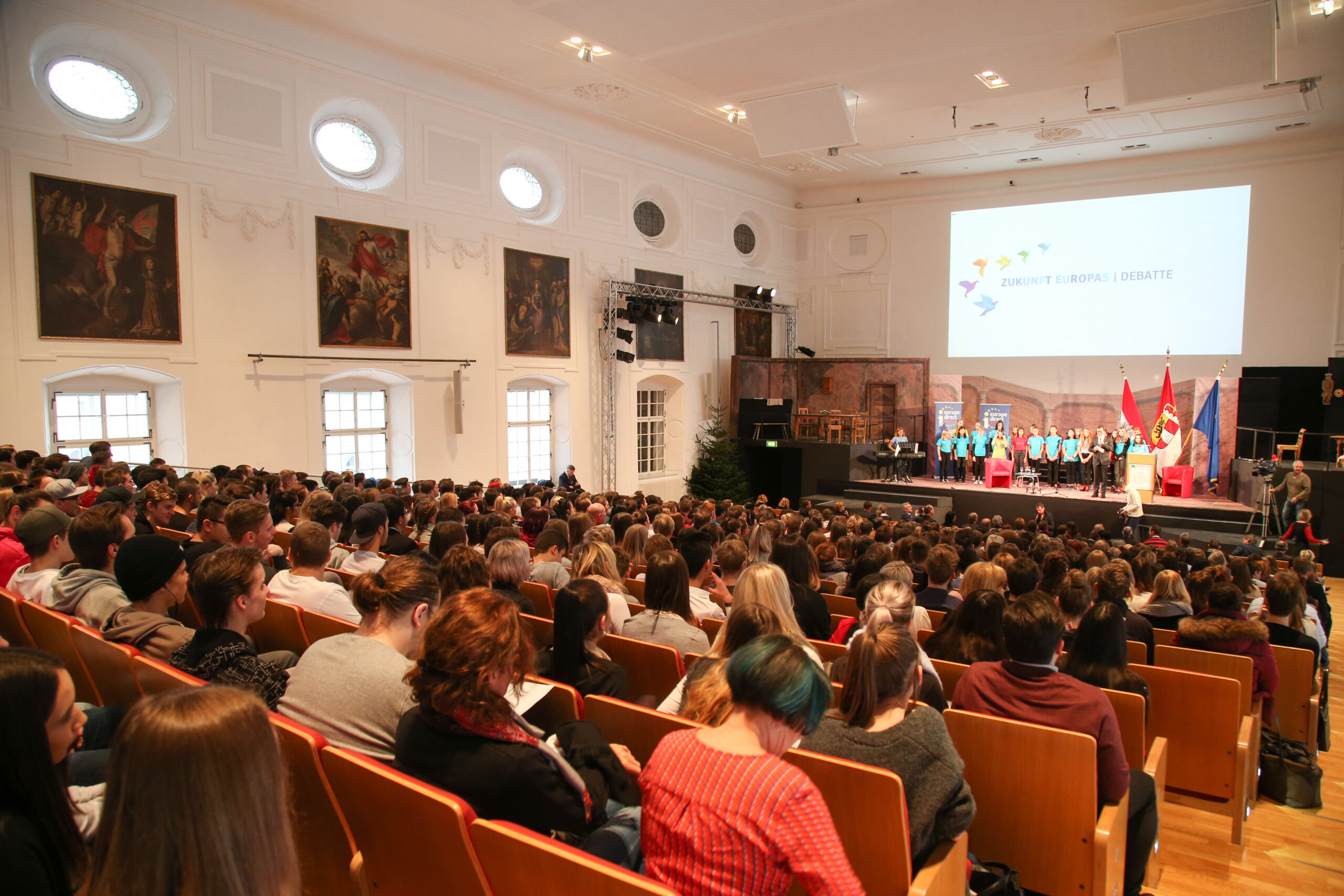 Aula von hinten – Blick in die Kulissen des „Salzburger Hirtenadvents“ anlässlich einer Jugendveranstaltung des EU-Bürgerservice des Landes Salzburg in der Großen Universitätsaula am 23.11.2017 mit Bundespräsident Alexander Van der Bellen © Copyright Alle Urheber- und Leistungsschutzrechte des Lichtbildhersteller (§§ 1, 2 Abs. 2, 73ff UrhG) stehen der Fotografin/dem Fotografen (LMZ/Neumayr/SB) zu. Nutzungsbewilligungen (Veröffentlichungsrecht etc.) gelten nur bei ausdrücklicher schriftlicher Vereinbarung als erteilt.