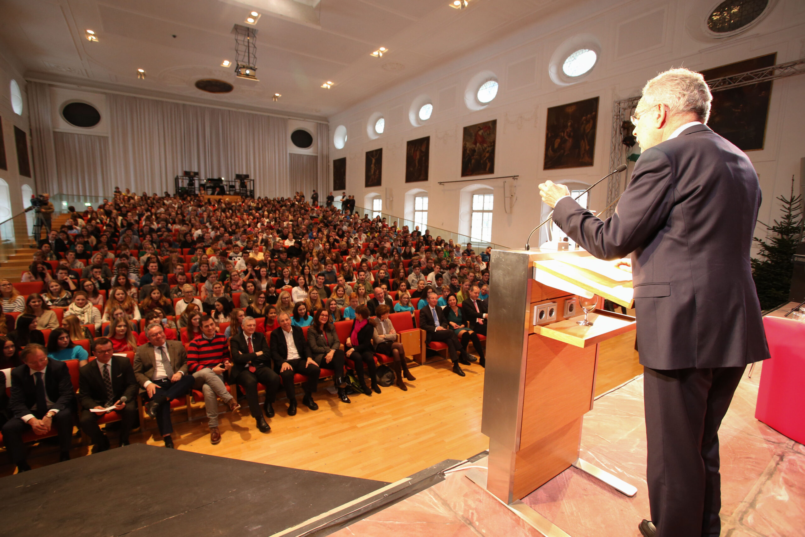 Bundespräsident Alexander Van der Bellen anlässlich einer Jugendveranstaltung des EU-Bürgerservice des Landes Salzburg in der Großen Universitätsaula am 23.11.2017© Copyright Alle Urheber- und Leistungsschutzrechte des Lichtbildhersteller (§§ 1, 2 Abs. 2, 73ff UrhG) stehen der Fotografin/dem Fotografen (LMZ/Neumayr/SB) zu. Nutzungsbewilligungen (Veröffentlichungsrecht etc.) gelten nur bei ausdrücklicher schriftlicher Vereinbarung als erteilt.