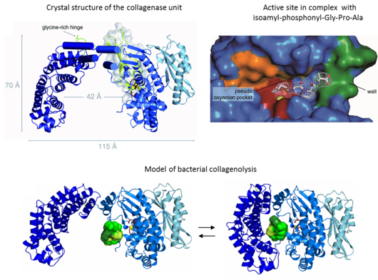 To undermine the defence mechanisms of the host, pathogens follow a classical strategy by imitating proteases of the host immune system. Of particular interest are bacterial collagenases which contribute to the host colonization and infiltration and thus enable host infection.