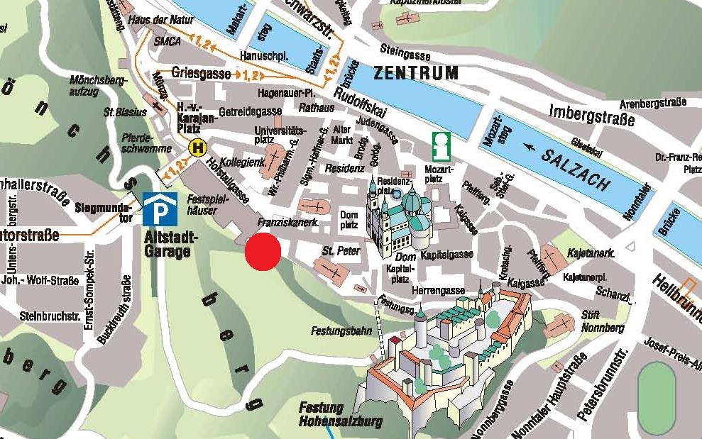 Hinweis zur Navigation: in Navigationsgeräten NICHT Mönchsberg 2 angeben, die Altstadt inkl. Mönchsberg ist für regulären Verkehr durch Poller gesperrt!