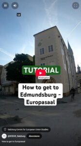 Von der Hofstallgasse nach den Festspielhäusern (Haus für Mozart) rechts abbiegen in den Toscaninihof. Auf der rechten Seite führen Treppen hinauf auf den Mönchsberg, sie enden direkt zwischen Edith-Stein-Haus und Edmundsburg. Der Eingang zur Edmundsburg befindet sich auf der linken Seite des Gebäudes (Glastür).