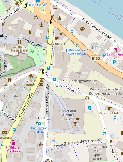 Wir befinden uns im Unipark Nonntal, 2. Stock, Stiege 4 (Hauptstiegenhaus, Tür 400, 1. Gang rechts), Sekretariat: 2.441