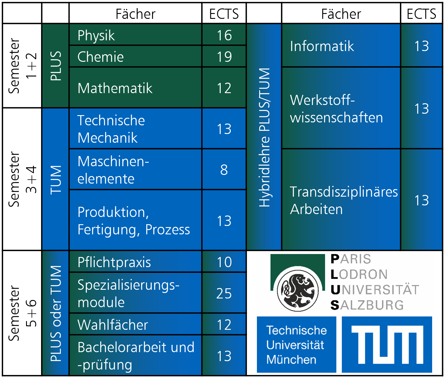 Der Bachelorstudiengang Ingenieur- und Werkstoffwissenschaften wird gemeinsam mit der TU München (TUM) angeboten und ist „interdisziplinär“ ausgerichtet. Dabei wird die Brücke zwischen der Mathematik, den Naturwissenschaften und den Technischen Wissenschaften geschlagen und es werden insbesondere Kompetenzen aus den Bereichen Physik, Chemie, Materialwissenschaften und dem Maschinenwesen entwickelt und miteinander verknüpft. Ziel ist es, herausragende, im naturwissenschaftlichen Denken geschulte Ingenieure auszubilden, welche in den verschiedensten Bereichen der Industrie Bindeglied zwischen der Forschung und Entwicklung einerseits und der Produktion andererseits sein können. Im Einzelnen verfügen die Absolventinnen und Absolventen über ein aus mehreren Disziplinen stammendes Methodenwissen und sind interdisziplinär geprägt. Dies bildet eine vielfältige Grundlage für eine Fortführung der Ausbildung im Rahmen von Masterstudiengängen wie Joint Degree Masterstudium Science and Technology of Materials, Master Maschinenwesen an der TUM und Chemistry and Physics of Materials an der PLUS. Im Beruf sind sie dazu in der Lage, ihre umfassenden wissenschaftlichen Kompetenzen zur Lösung praktischer Probleme nutzbar zu machen.