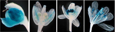 Miox-genes are transiently expressed during development. The four stages of a flower development show the changing expression pattern visualized with the GUS reporter gene.