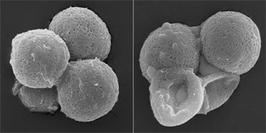 Pollen tetrades of wild type plants (left) and heterozygous knockouts (right) in the gene for UDP-sugar pyrophoshorylase. Note that during meiosis, two out of the four pollen die because they contain the defect copy of the gene