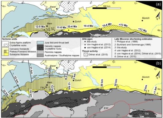 von Hagke, C., Cederbom, C.E., Oncken, O., Stöckli, D.F., Rahn, M.K., Schlunegger, F. (2012) Linking the Northern Alps with their foreland: the latest uplift and erosion history resolved by low temperature thermochronology, Tectonics 31(5), TC5010
