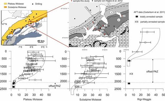 Figure 2: Thermochronological data from the Swiss Molasse Basin (compiled from Cederbom et al. 2011). There is no obvious difference in exhumation between the Subalpine Molasse and the Plateau Molasse. Furthermore, the data from Rigi (including new data) does not fit in the general pattern, which may be explained by hydrothermal fluxes.