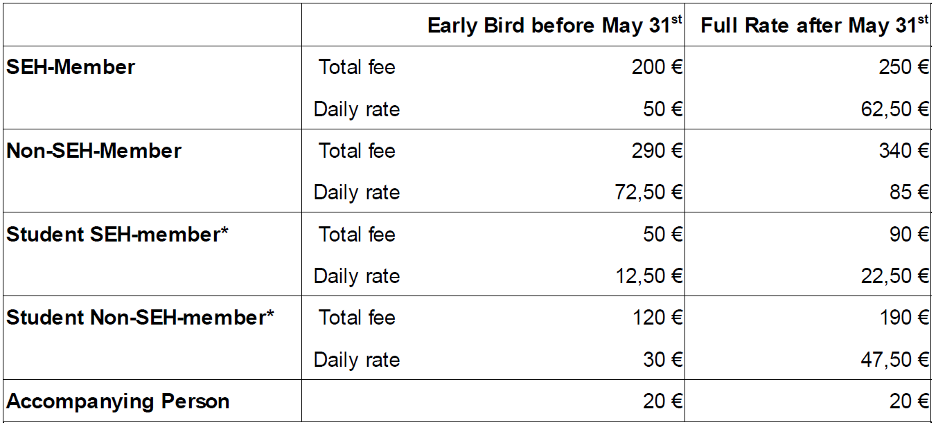 The registration fee for participants and students (SEH member and non-member) includes the following services: