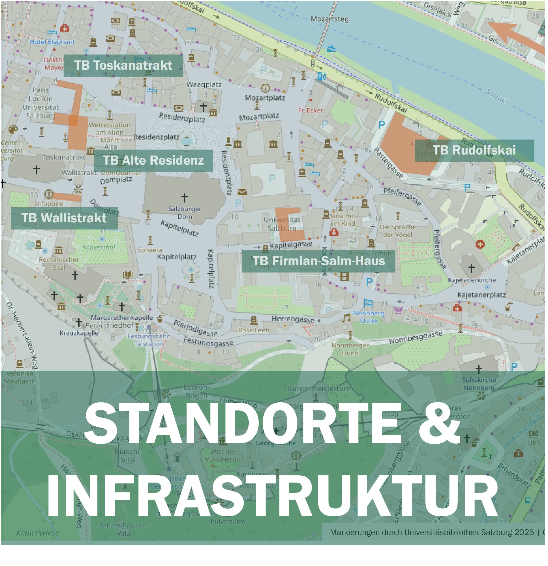 Die Universitätsbibliothek Salzburg ist für die bestmögliche Literatur- und Informationsversorgung für Studium, Lehre und Forschung an der Universität Salzburg verantwortlich. An allen unseren Standorten stellen wir Lern- und Arbeitsplätze sowie Unterstützung bei der wissenschaftlichen Informationsrecherche für alle Benutzer:innen zur Verfügung.