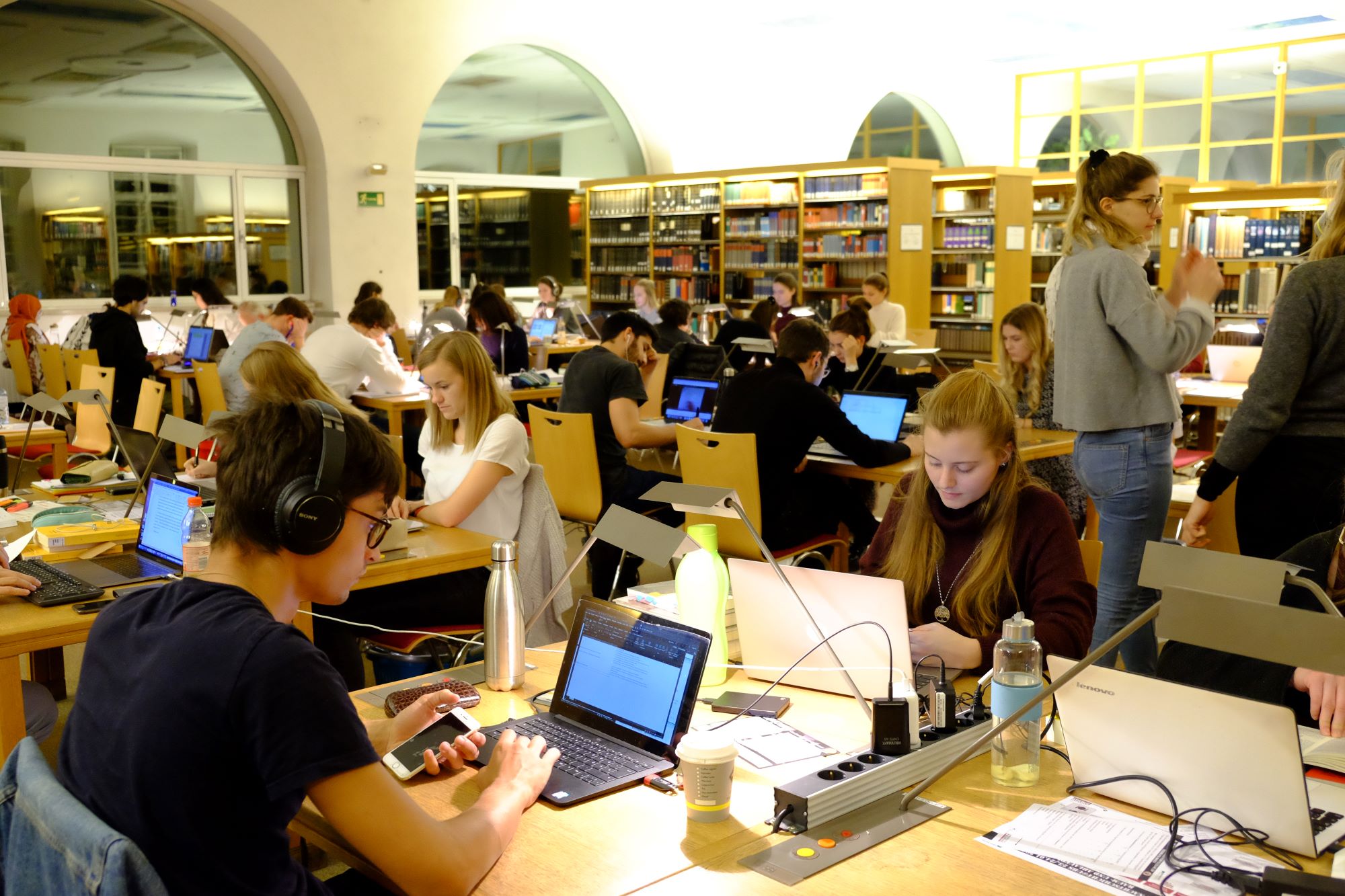 Am 20. Juni 2024 fand an der Universitätsbibliothek Salzburg in Kooperation mit der ÖH Uni Salzburg von 18:00 bis 00:00 Uhr die 11. Nachtschicht statt – erneut ein großer Erfolg. Zahlreiche Studierende nutzten verlängerte Öffnungszeiten und Infrastruktur der Hauptbibliothek Hofstallgasse, um bis Mitternacht an ihren schriftlichen Arbeiten zu feilen, sich auf Prüfungen vorzubereiten oder nach Quellen zu recherchieren. Um 22.00 Uhr erreichte die Nachtschicht ihren Höhepunkt mit über 150 Teilnehmer*innen. Selbst nach 23.00 Uhr waren noch über 100 Personen im Haus. Mitarbeiter*innen der Universitätsbibliothek Salzburg boten individuelle Beratung zur Literatursuche und