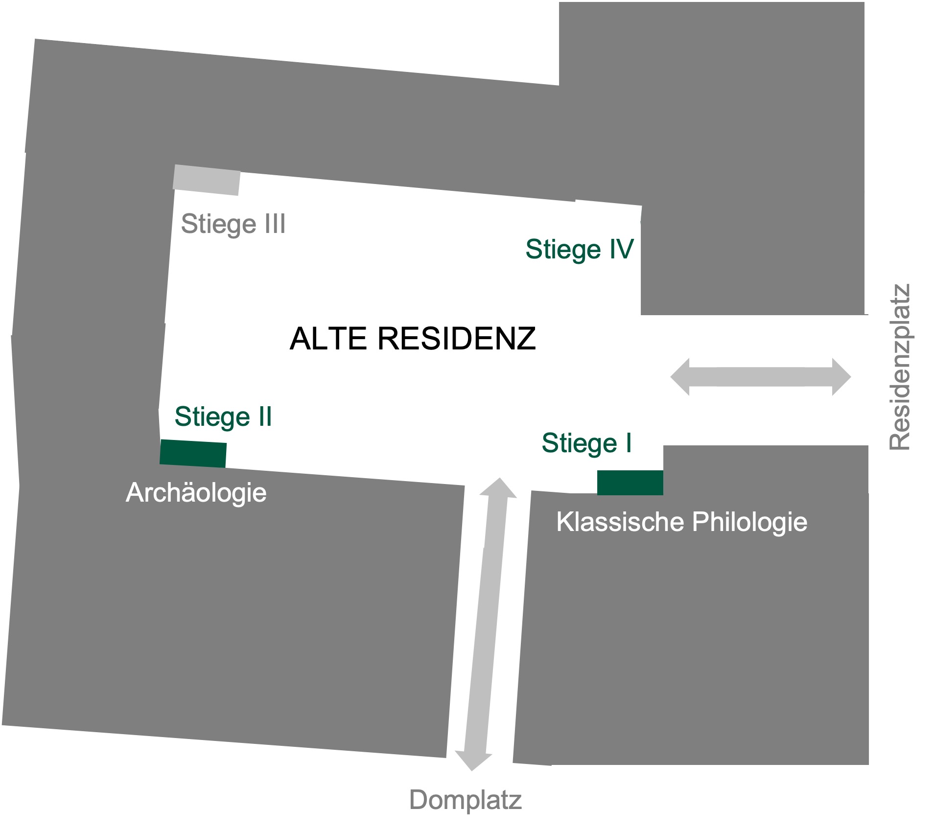 Der Eingang zur Teilbibliothek befindet sich im Innenhof, Stiege I (siehe Abb., grüne Markierung)