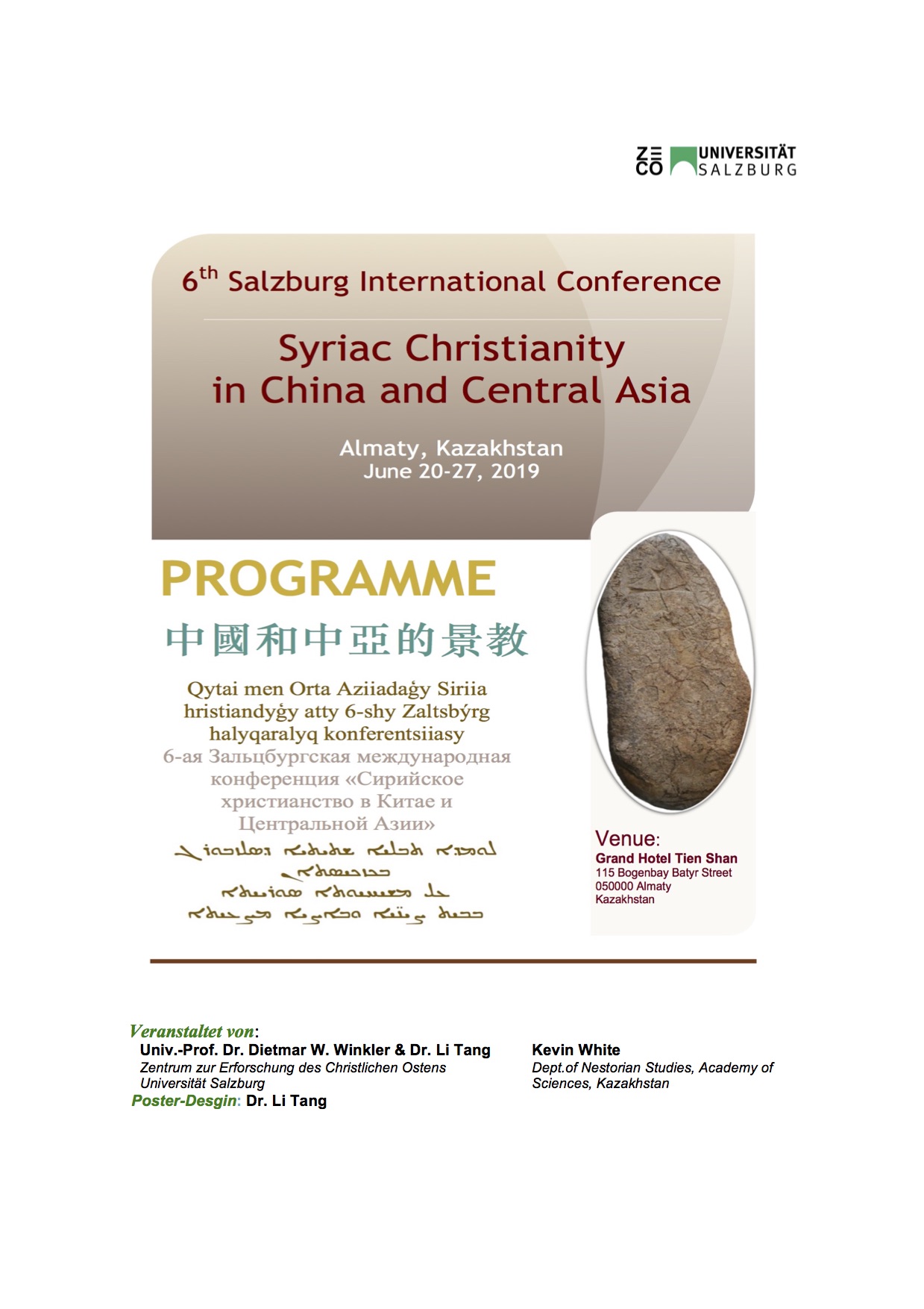 We are pleased to announce that the 6th Salzburg International Conference on Syriac Christianity in China and Central Asia will be held in Almaty, Kazakhstan in June, 2019. The conference will be organized by the University of Salzburg / Center for the Study of the Christian East (ZECO) in cooperation with the Archaeological Institute of Kazakhstan Academy of Sciences / Department of Nestorian Studies.